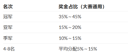 尽管奖金波动性较大,但对于顶级选手而言,是收入的重要组成部分。冠军奖金往往由战队与选手分成,一般按下列比例执行: